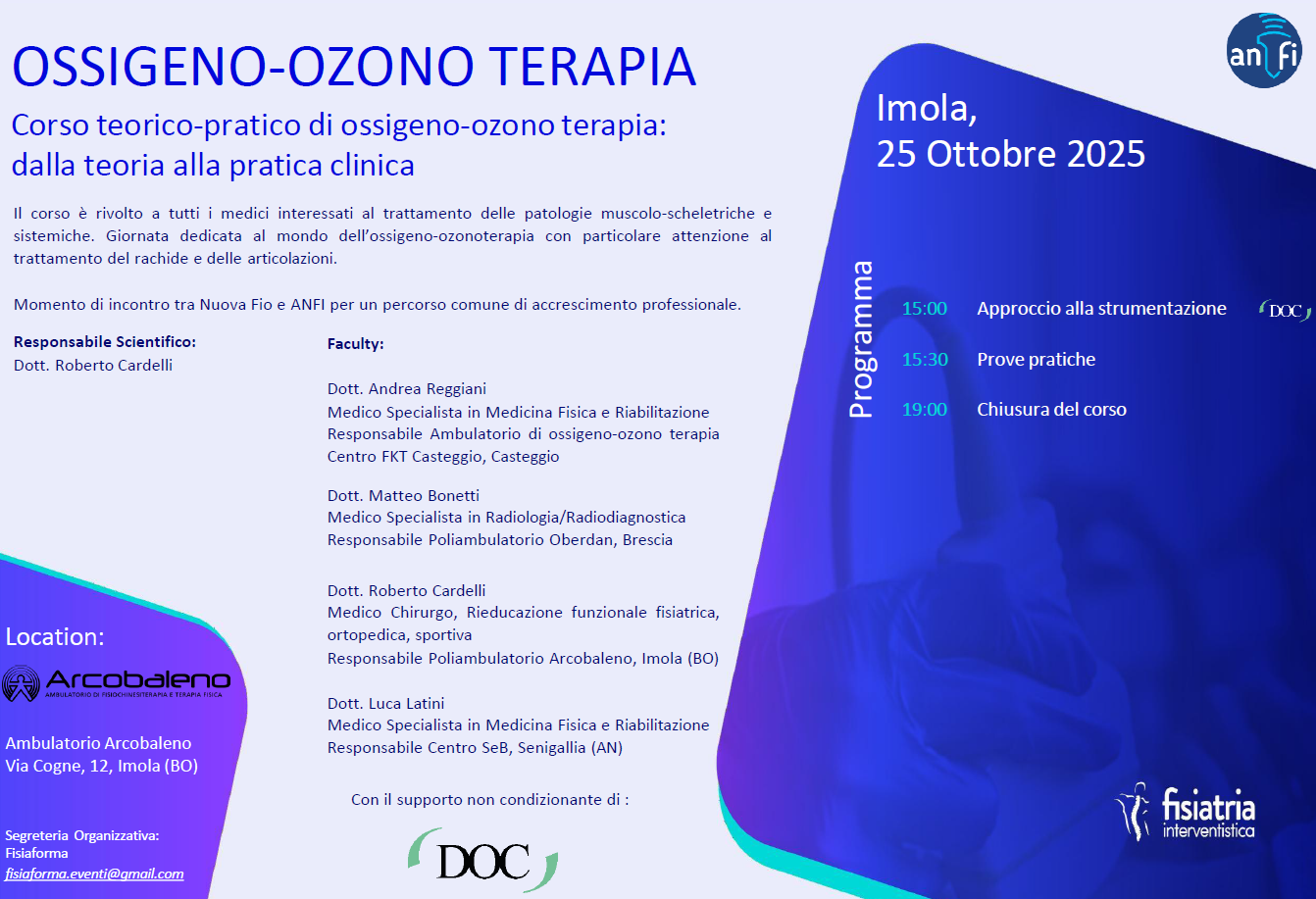 Questa giornata rappresenterà ancora una volta un momento di incontro tra la Nuova Federazione Itraliana di Ossigeno Ozono Terapia (FIO) e l’ Associazione Nazionale Fisiatria Interventistica (ANFI) per un percorso comune di accrescimento professionale.